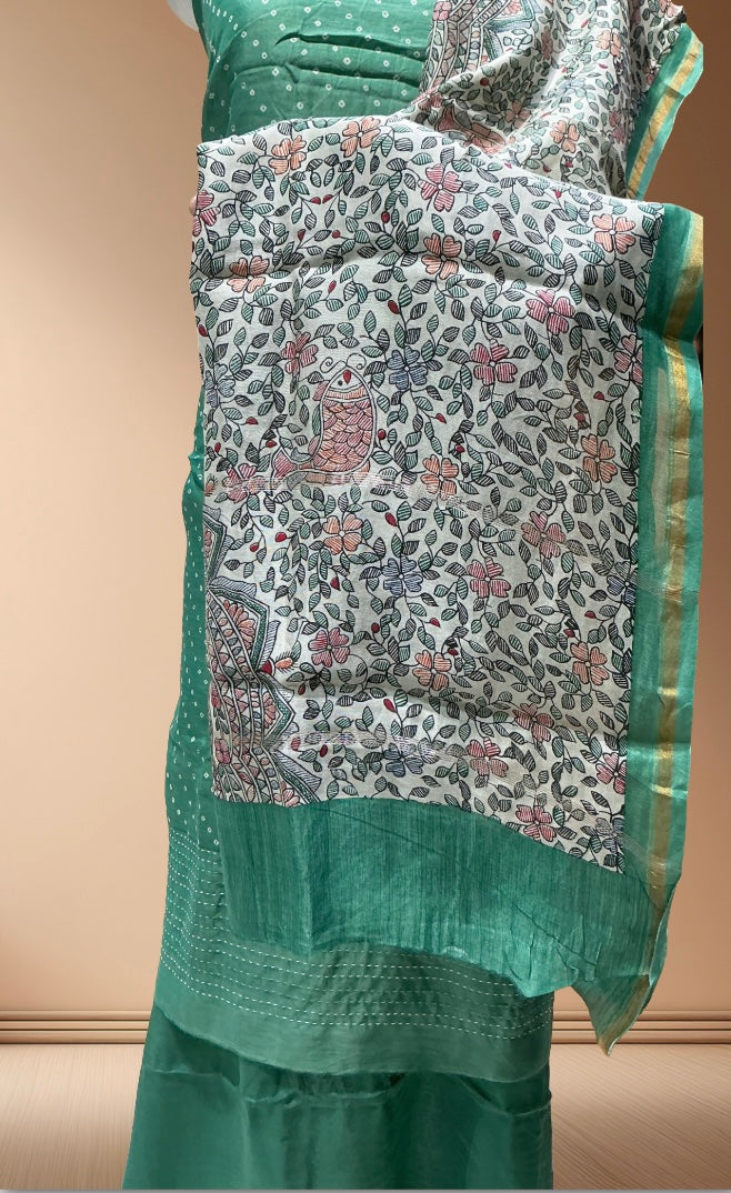 Green: Maheshwari silk suit with Kantha work on the border, paired with a cotton silk bottom and Maheshwari silk dupatta featuring Madhubani print on the dupatta and shirt border; set includes 2.5 mtr shirt, bottom & dupatta