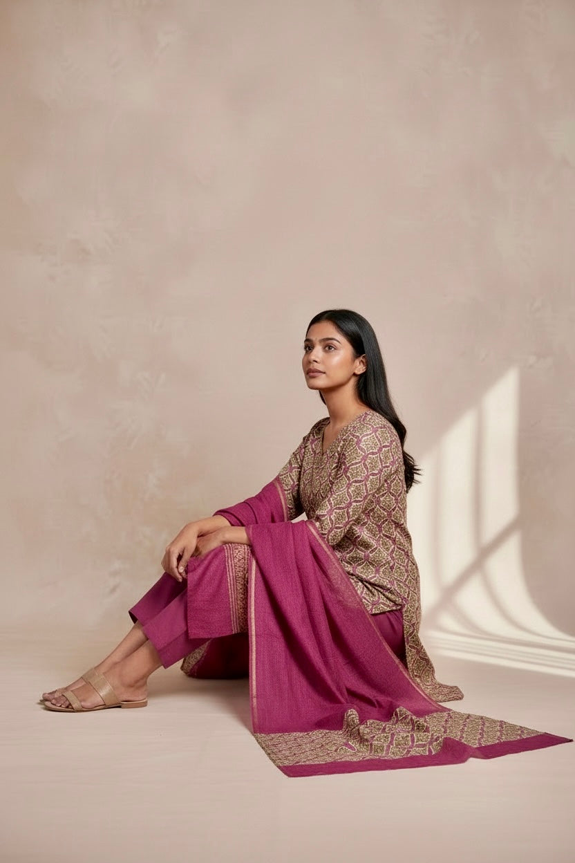 Soft yet striking, the pink Maheshwari silk suit with traditional printing adds a fresh and feminine touch to traditional wear. Perfect for daytime festivities and elegant occasions.