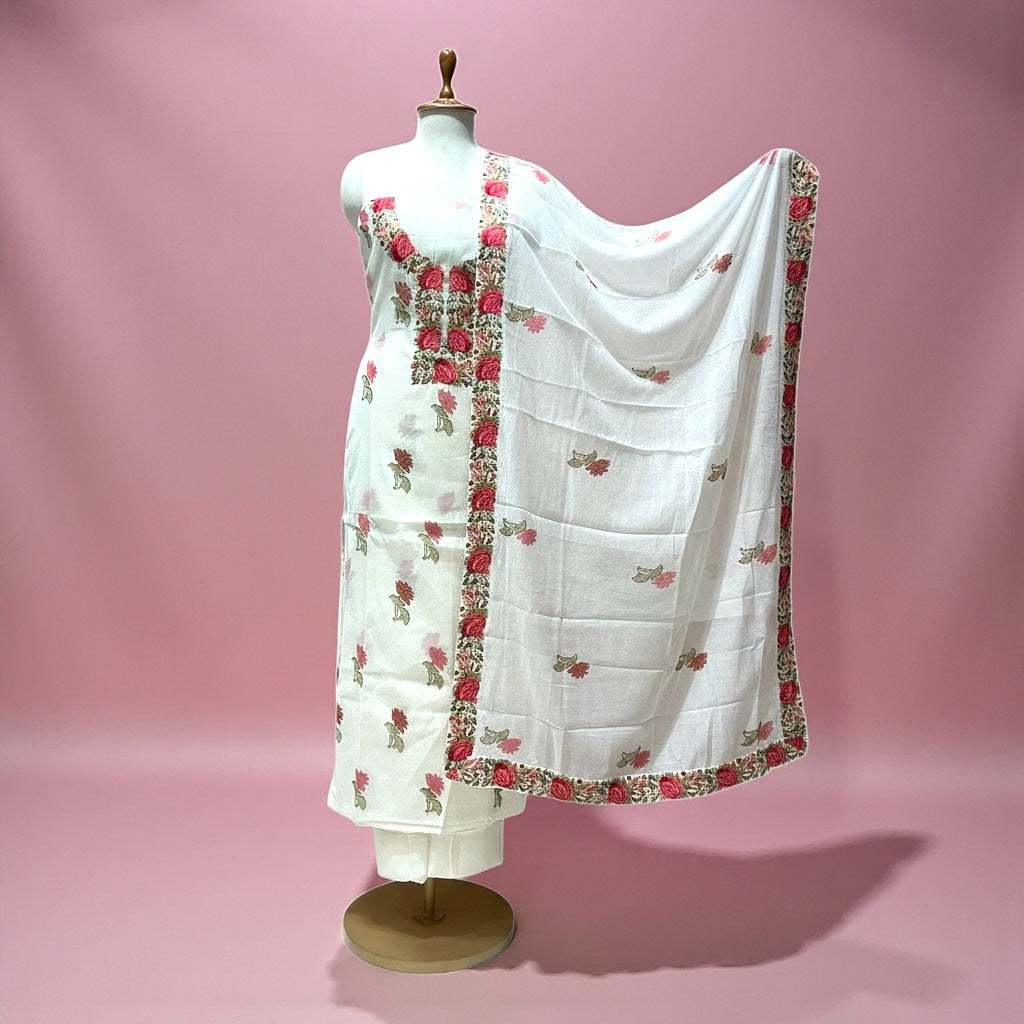 MUL CHANDERI PARSI WORK SUIT WITH BLOCK PRINT - offwhite