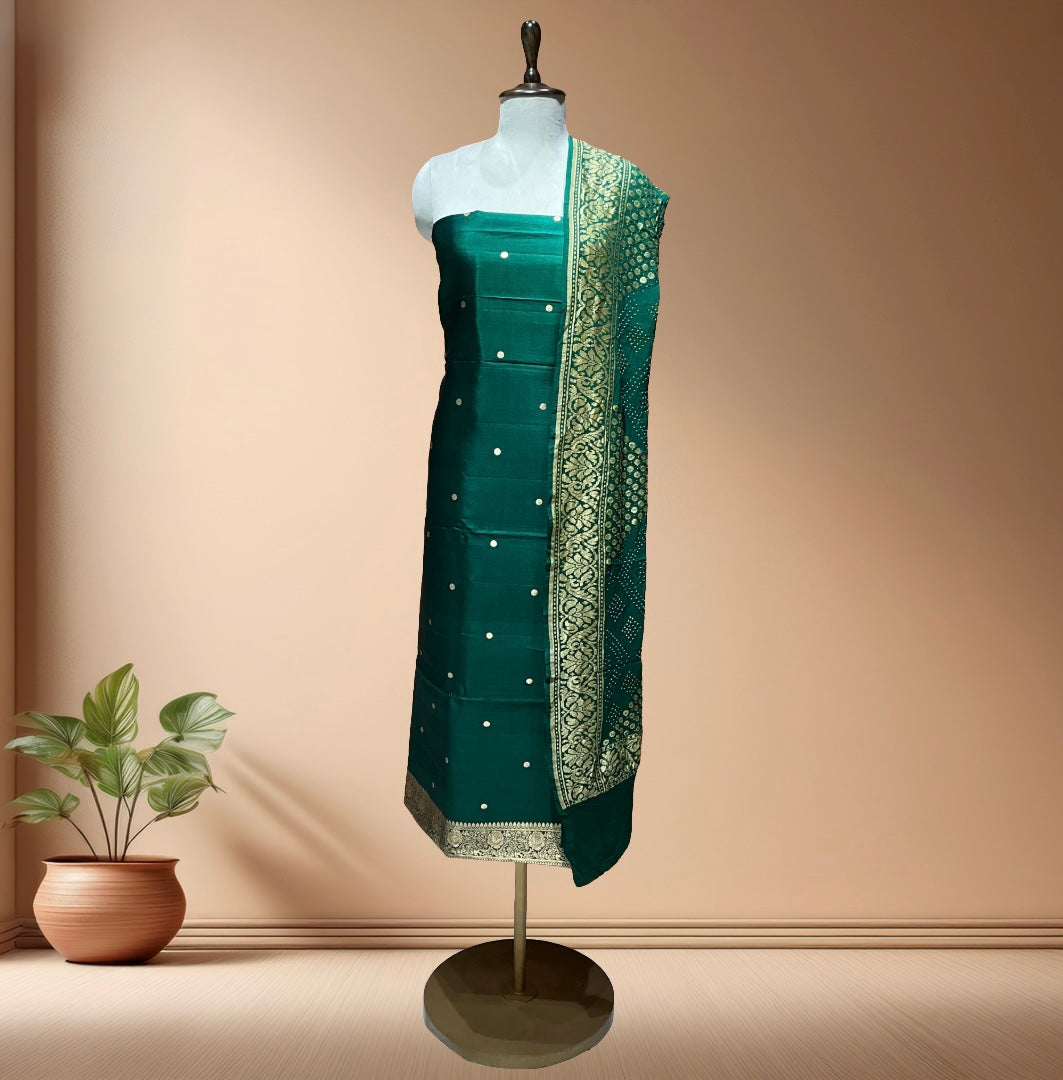 Pure katan Silk Suit With Bandhani Dupatta - Bottlegreen