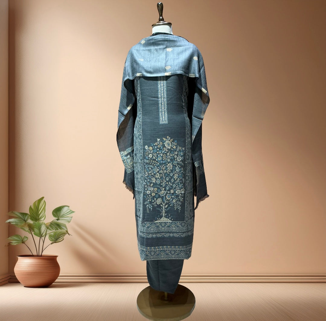 Pure pashmina weaving made from pure pashmina woollen jacquard fabric, complemented by a matching dupatta. The soft grey tone offers understated sophistication.