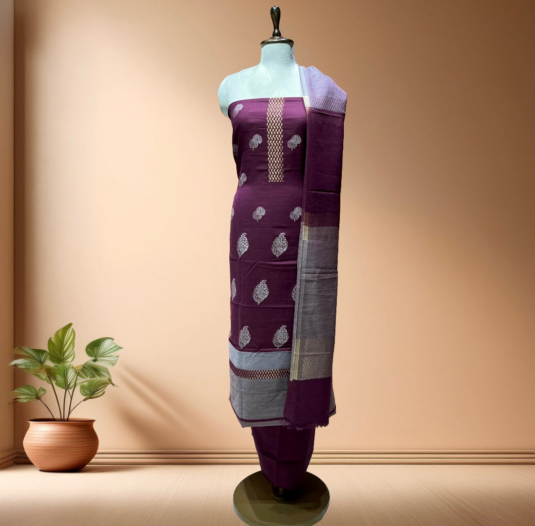 Pure pashmina weaving crafted in rich pure pashmina woollen jacquard fabric, paired with the same dupatta. The wine colour brings a regal and festive touch.